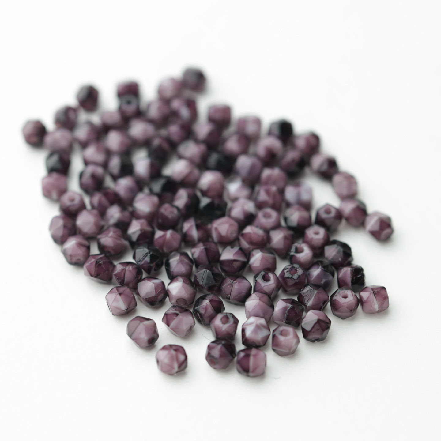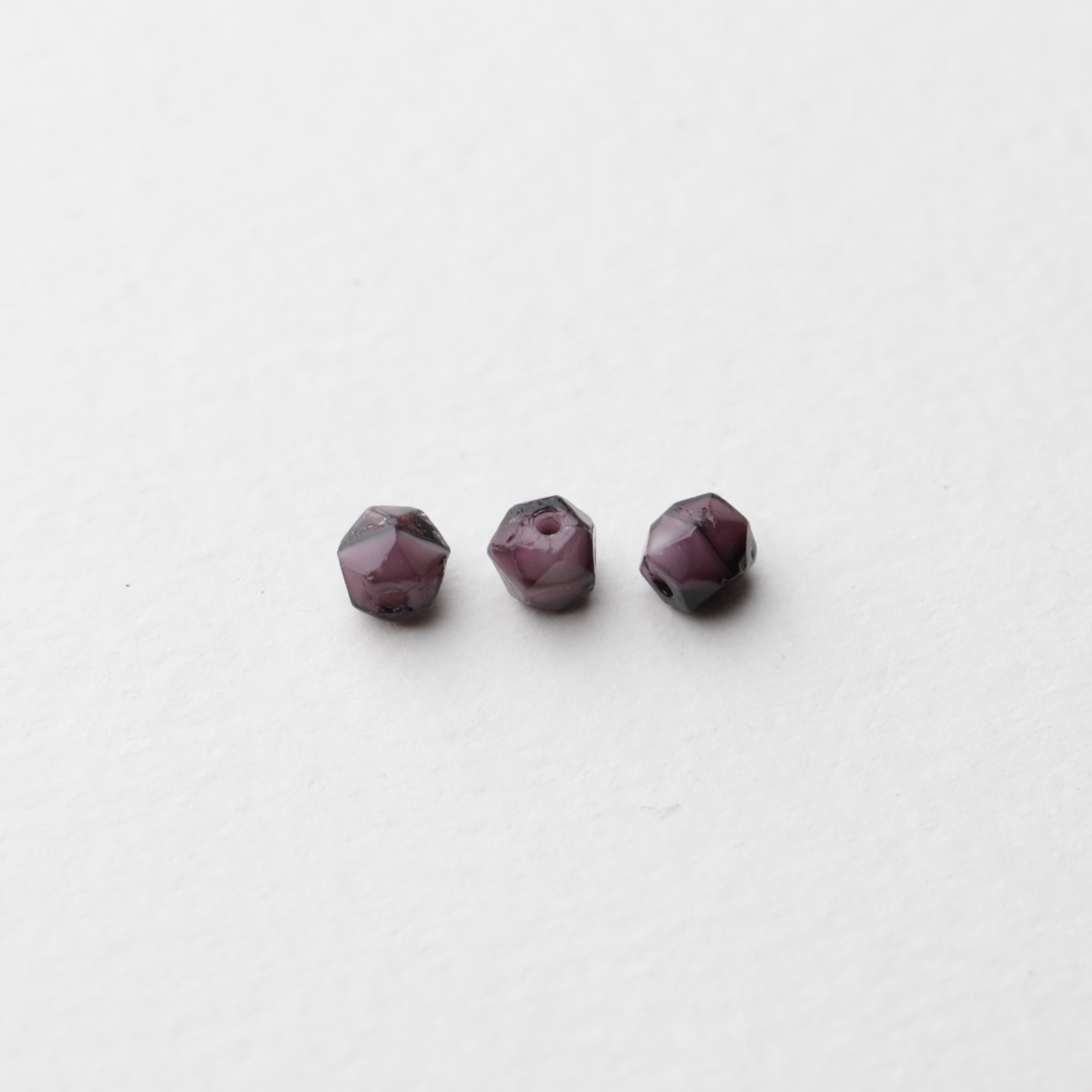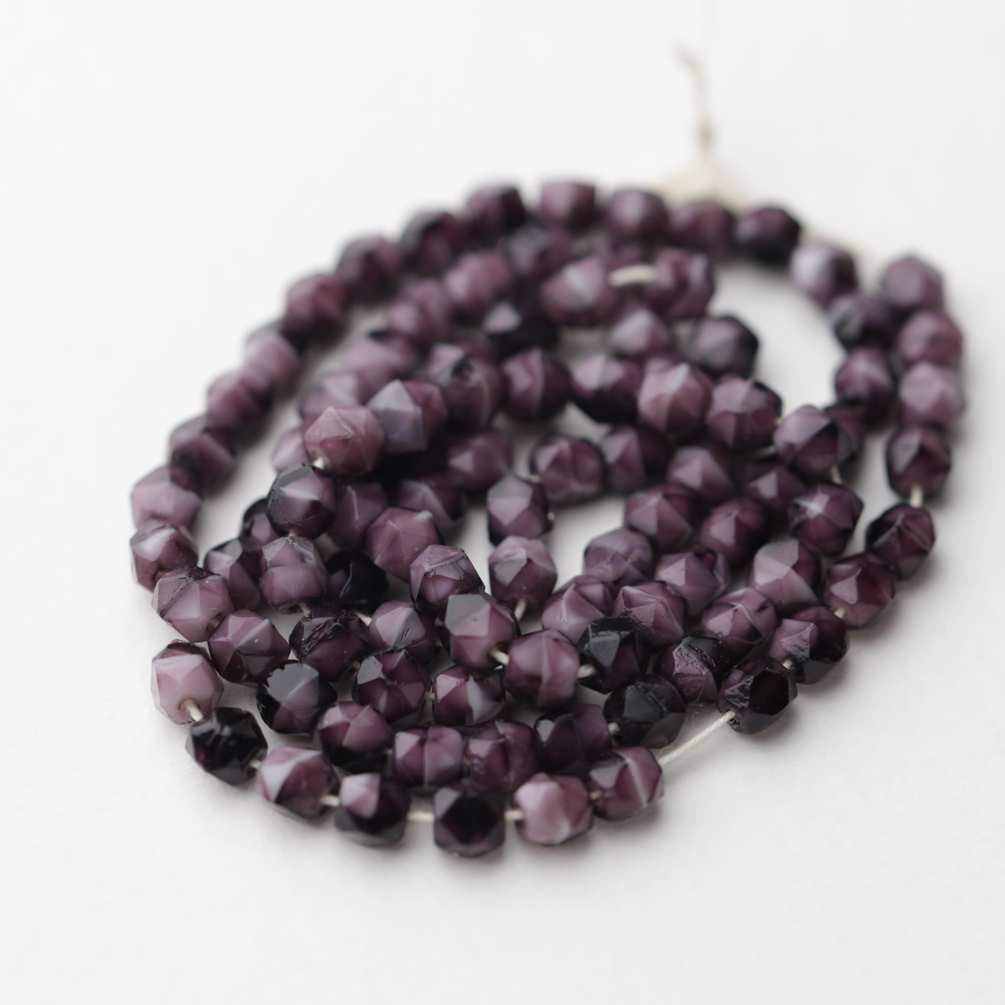 フランスからやってきたヴィンテージガラスビーズ。 こちらは1920〜50年代頃にフランスまたはチェコで作られたようです。 紫のマーブル模様です。 サイズは約4mm×3.5mmで丸にカットが入った独特な形。 古いものなので大きさや形の相違や色ムラがあります。 ガラスの性質として白が強く出ていたり、透明なものもあり 95個から100個のセットです。