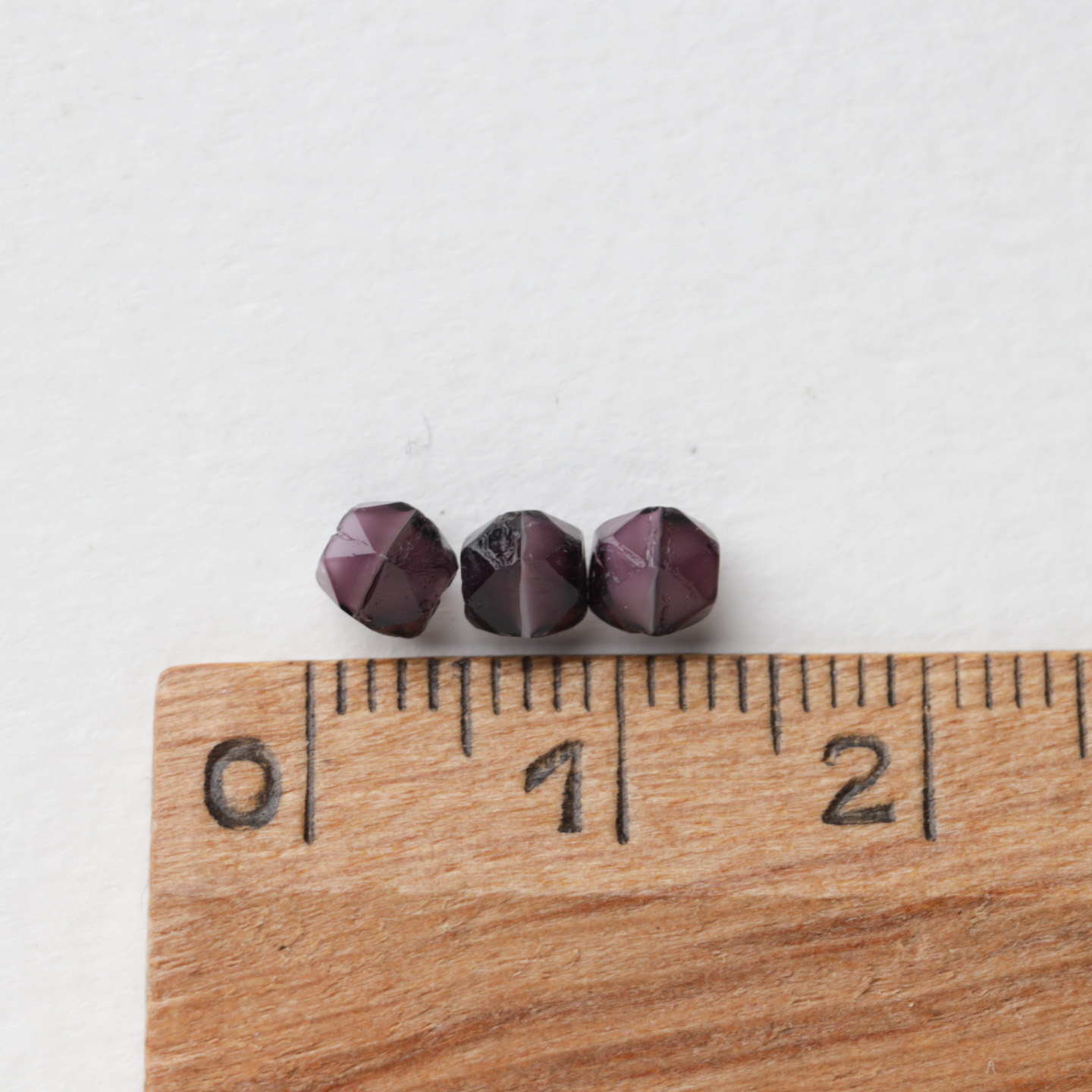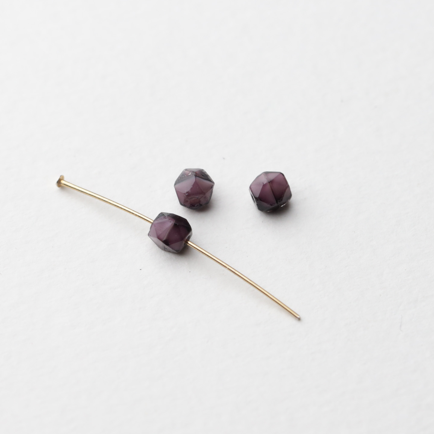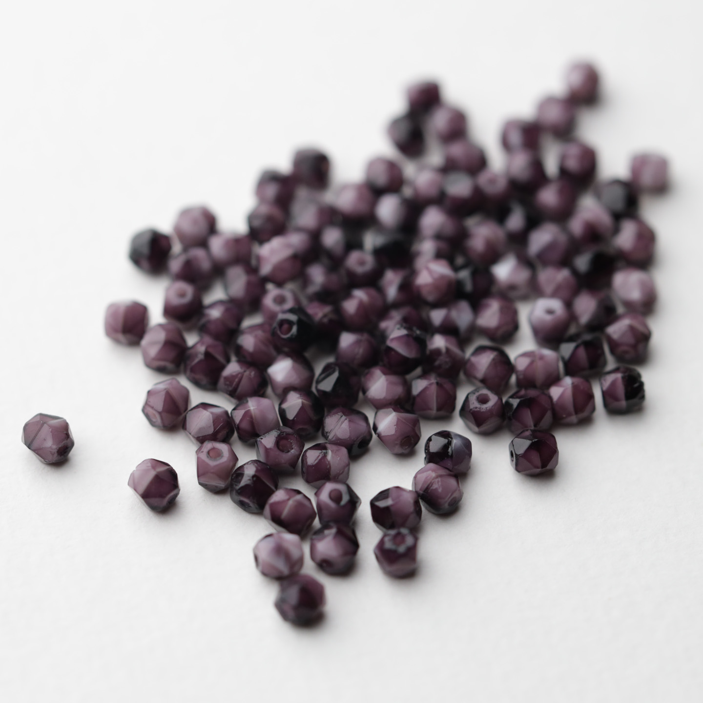 フランスからやってきたヴィンテージガラスビーズ。 こちらは1920〜50年代頃にフランスまたはチェコで作られたようです。 紫のマーブル模様です。 サイズは約4mm×3.5mmで丸にカットが入った独特な形。 古いものなので大きさや形の相違や色ムラがあります。 ガラスの性質として白が強く出ていたり、透明なものもあり 95個から100個のセットです。