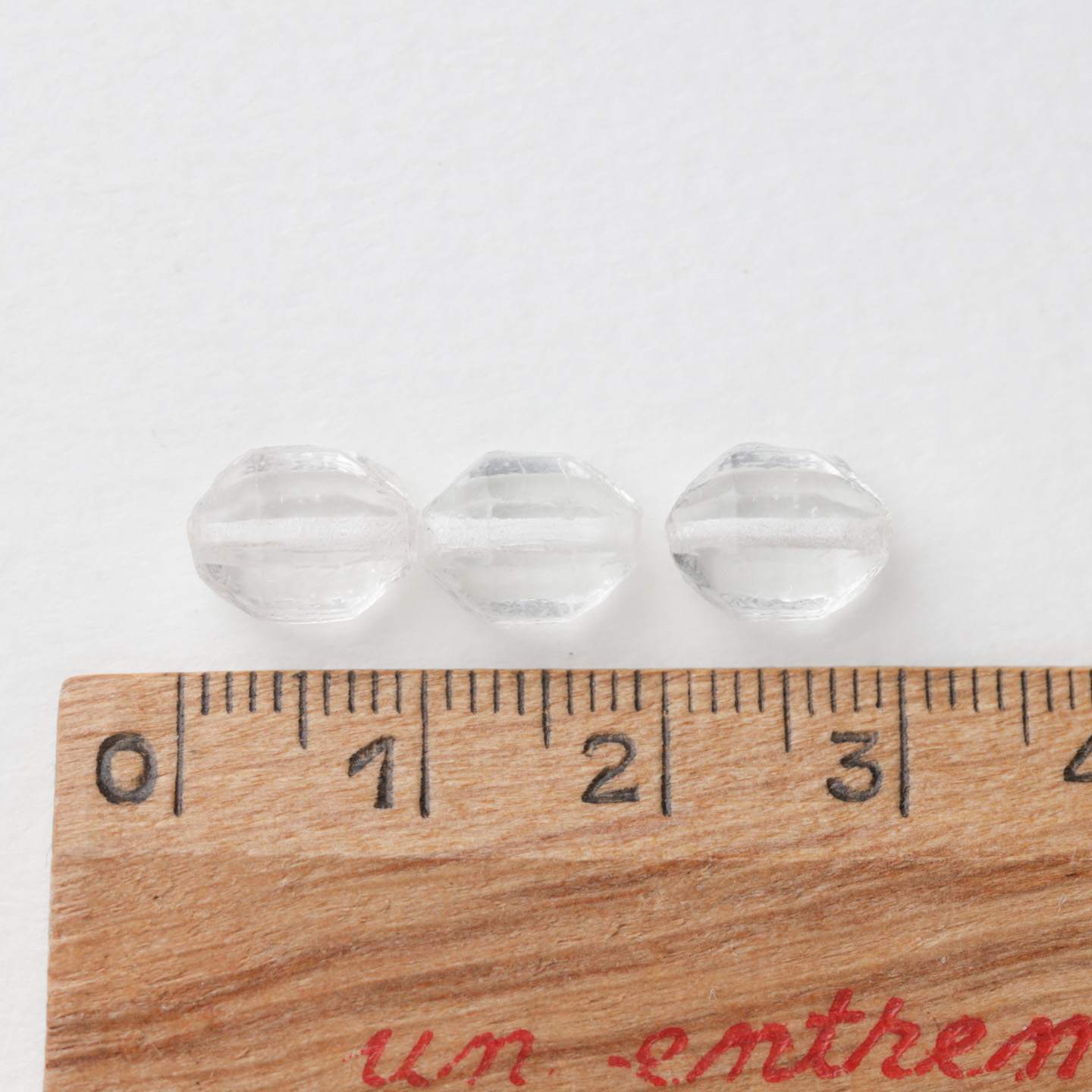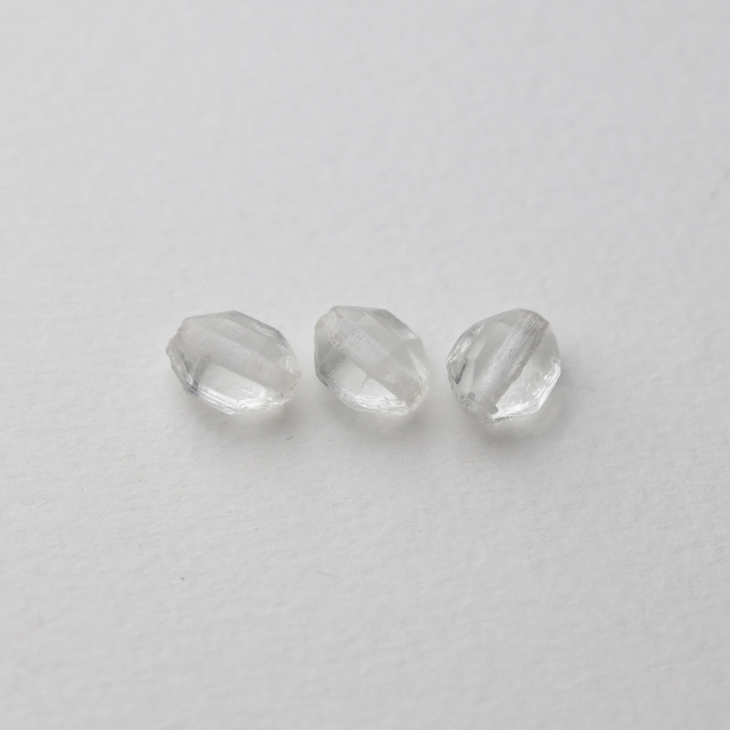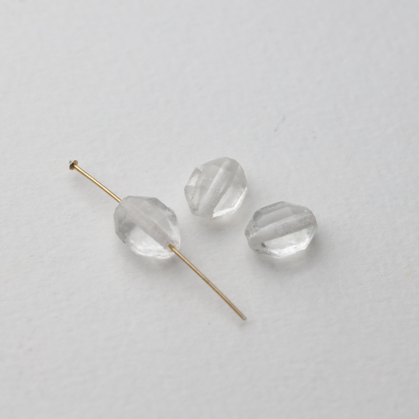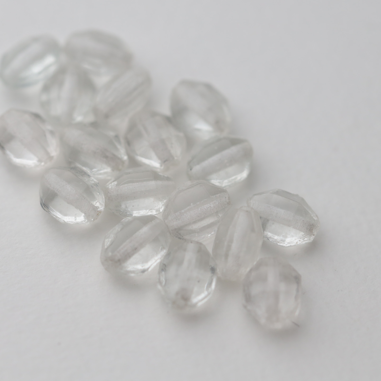 フランスからやってきたヴィンテージガラスビーズ。 こちらは1920〜50年代頃にフランスまたはチェコで作られたようです。 平たい楕円形で表面にカットが入っていて昔のガラスらしい趣があります。 サイズは約10×7mmで20個セットのお値段です。