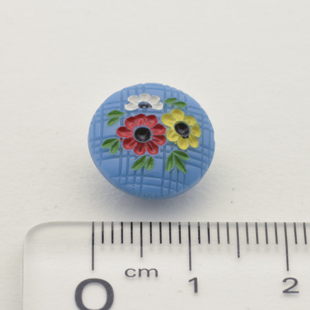 ヨーロッパの手彩色ガラスボタンです。2個セットのお値段です。 地模様に小花が彫りこまれてひとつずつ手で彩色されています。 手作りのぬくもりがあるボタンです。 お色は画像よりやや濃いめです。 ※手彩色のため、洗うと色落ちする場合があります。